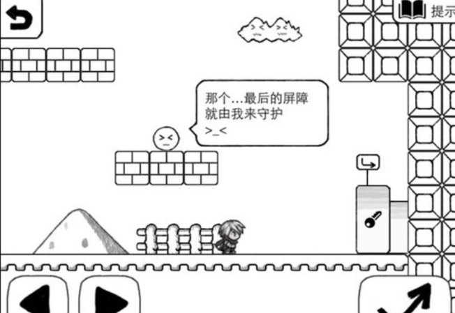游戏开始的时候,我们能看到冒险家身后有一颗树,直接跳到树上。这棵树可以往上拔高,拖动树到右边虚线方块的位置就可以了,不然拖太高树会消失。然后直接从树上跳到右上方捡起钥匙。拿到钥匙后,按原路返回,然后从下方一路走到水管前,直接进去就可以进入下一个场景了。一进入城堡,我们能看到墙上有三个显示器,里面都是冒险家之前遇到过的危险和失败,原来冒险家一直被监视着。而之后我们会遇到国王,国王就是最终boss,一直监视我们的也是他,在一段对话后,我们选择“投降”。然后点击右上方的“提示”按钮,我们把之前找到的神器碎片拼凑到愚蠢的开发者身上,就会显现出开发者的真实样貌。