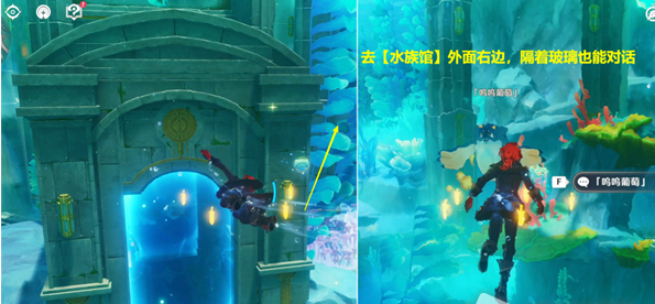 (1)第3次任务过来后,【呜呜葡萄】会躲在【水族馆】石柱后面这里,对完话后出【水族馆】