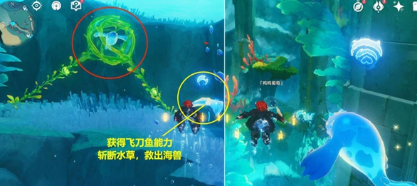 (3)当喂第1次【鱼肉】后,膨膨兽【呜呜葡萄】会让我们去救被水草困住的朋友,位置就在上图说的【水族馆】外面右边