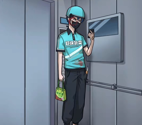 4、到三楼的时候上来一个外卖小哥,点击他的脸上,手上,裤袋和外卖盒。